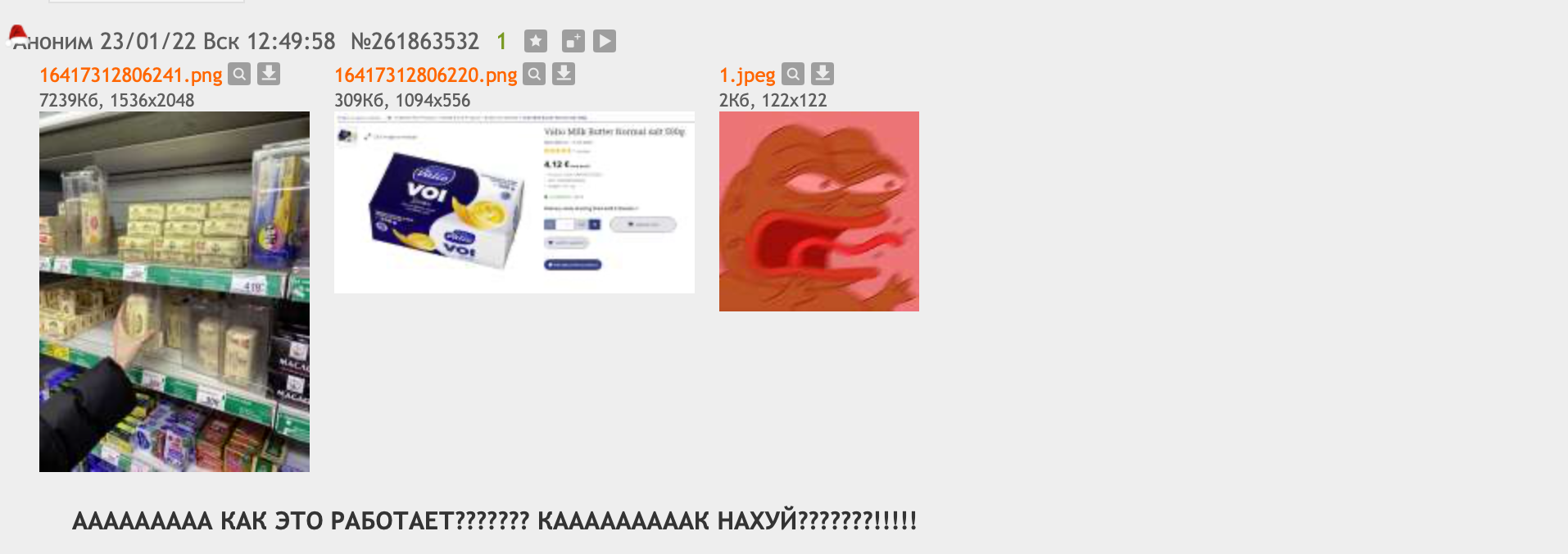 >>261874668 (OP) Пчел, ты цены в магазинах видел? Люди просто охуевают от того, что они в очередной раз стали беднее. И закономерно создают об этом треды. Не надо быть никаким хохлом, чтобы охуевать от происходящего в нашей ядерной энергетической сверхдержаве.