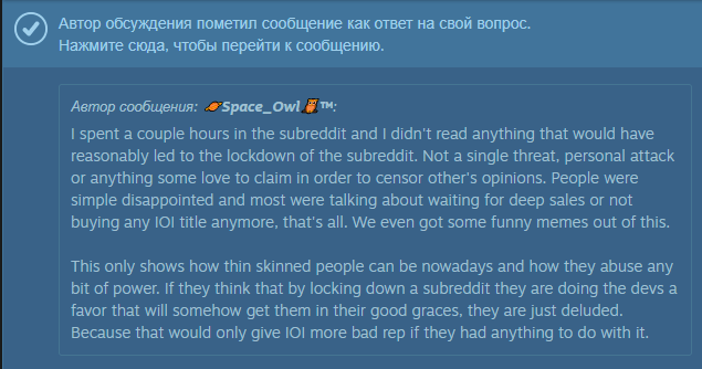 Я вот ни разу не оправдываю ни цену в Стиме, ни баги в последнем апдейте но по моему люди перегибают палку. Всё время ИОИ пилили годноту, продавали по норм ценам на скидках, слушали фанатов, а тут обосрались один раз - и всё, пиздец, любовь прошла, жадные мрази, бойкотируем их. Я не собираюсь брать игру по фулл прайсу, но может рано их хуесосить? До ЕА, Юбиков и Дайсов им ещё ебать как далеко.