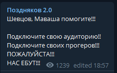 Но тут прибежал Поздняков и его малолетний скам. Они голосуют за ФСИНовца, за того, кто будет ШВАБРИРОВАТЬ народ. Нам нельзя этого допустить. Они уже дико горят!