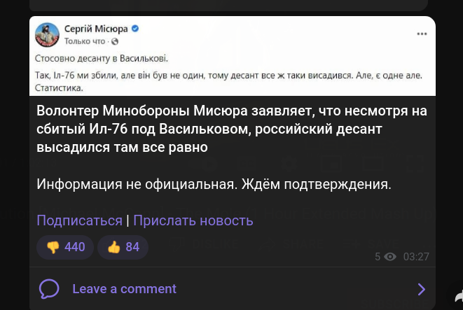 >На проспекте Победы 101 бригада охраны ночью уничтожила не туда заехавшую колонну, Т-64, два грузовика и две каких то легковушки, возможно посторонние. Живых как и с гостомельскими зенитчиками не оставили