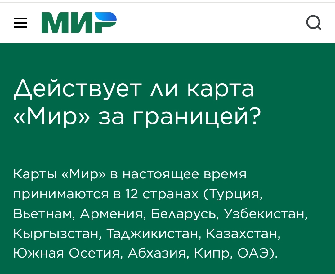 При этом трансграничные операции по картам VISA и MasterCard будут недоступны. Это касается как оплаты покупок в иностранных интернет-магазинах, так и использования этих карт за рубежом. В случае выезда за границу рекомендуется брать с собой наличную валюту и карту «Мир» для тех стран, где она принимается. На сегодняшний день это Турция, Вьетнам, Армения, Белоруссия, Казахстан, Киргизия, Таджикистан, Южная Осетия и Абхазия.