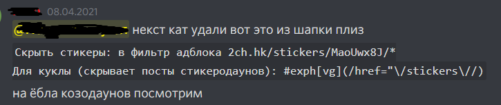 Для куклы (скрывает посты стикеродаунов): #exph[vg](/href="\/stickers\//)