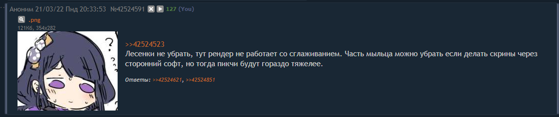 >>42524523 Лесенки не убрать, тут рендер не работает со сглаживанием. Часть мыльца можно убрать если делать скрины через сторонний софт, но тогда пикчи будут гораздо тяжелее.