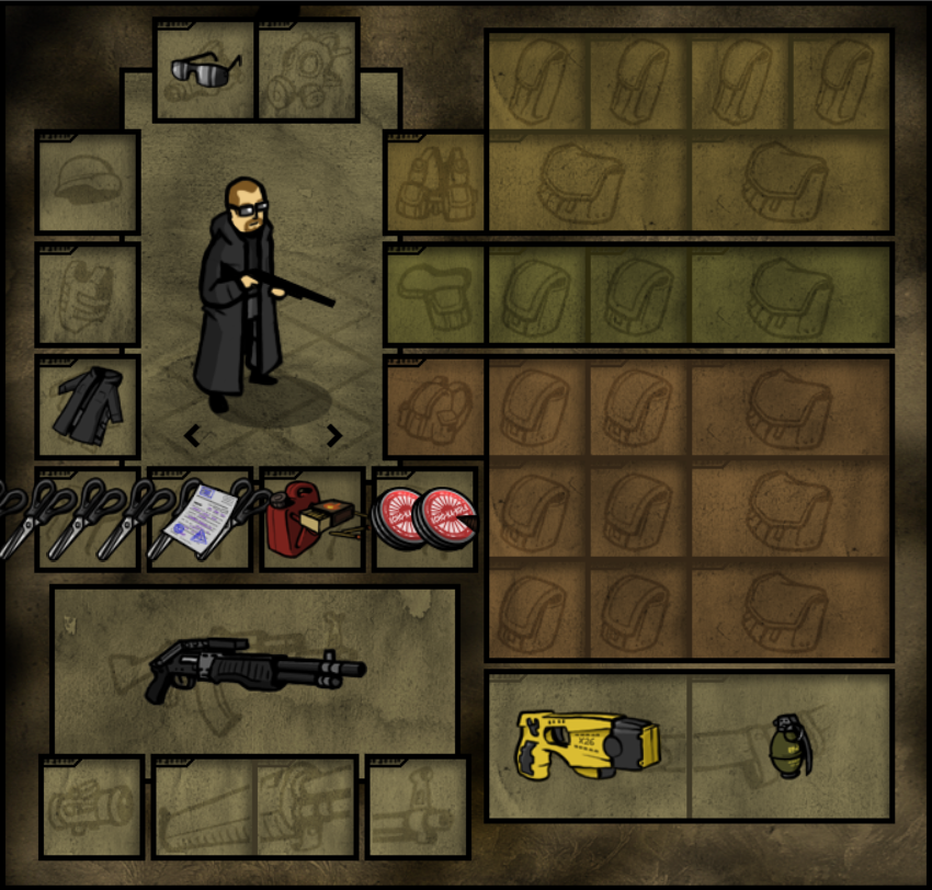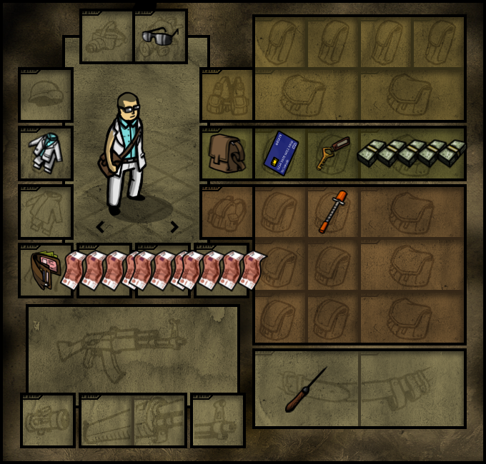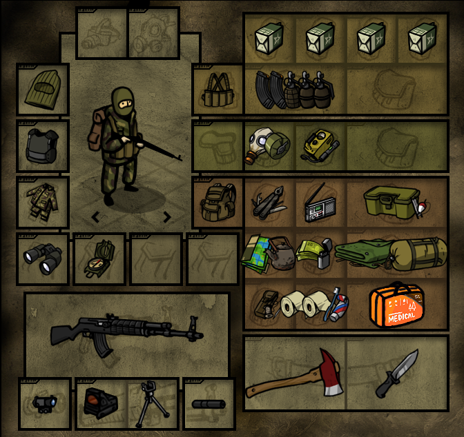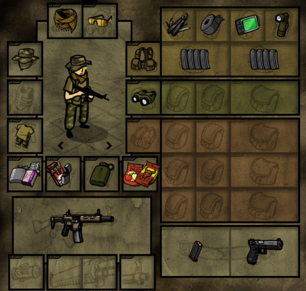 Если прям выживание как в таркове то такое, если в какой-нибудь раине то оружие можно убрать. А так, бронежилет под одеждой, при этом форма которая будет выглядеть как гражданская. Каска строительная, от мало-мальских осколков защитит. Еда с большим количеством калорий и сахара, вода, медицина, топорик для дров, ножик для еды.