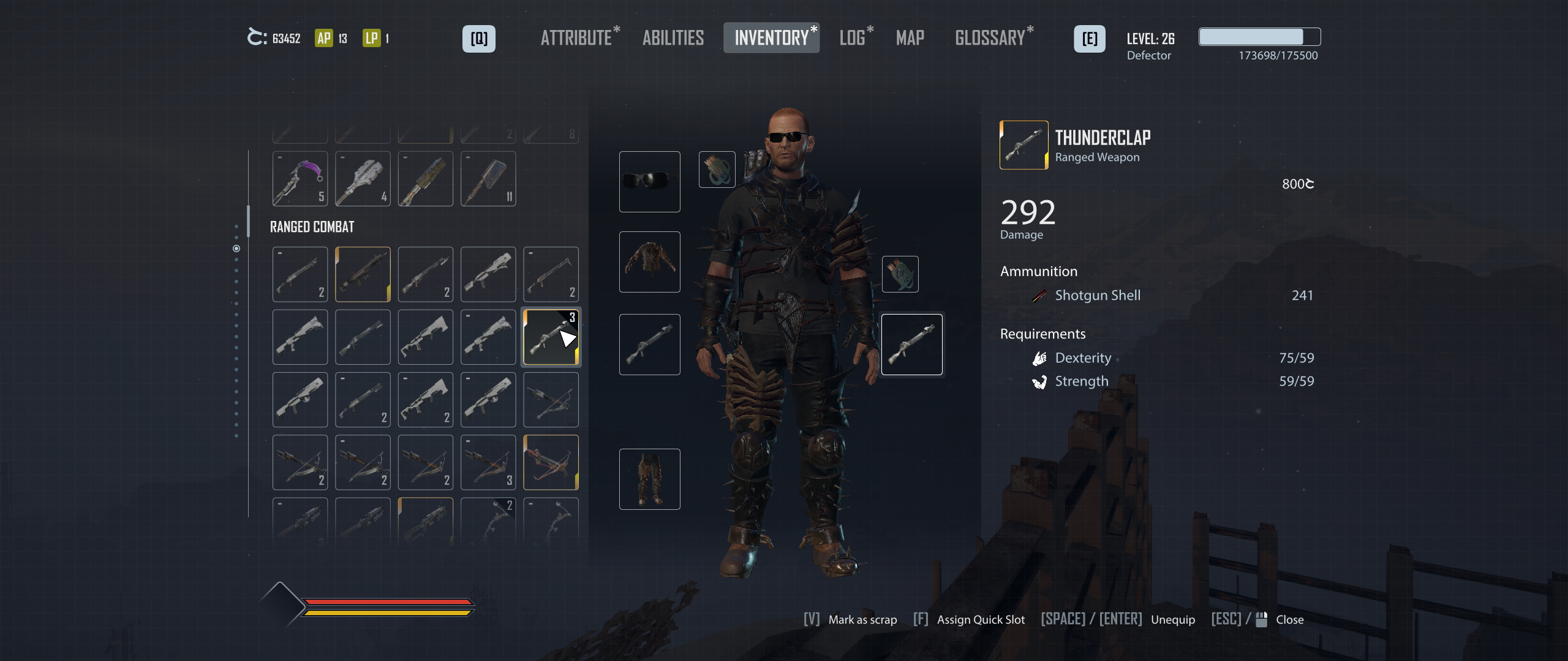 Вот сравнил поношенный дробовик и скрафченый из поношенных лук, требуемые статы явно не на стороне дробовика. Правда его тоже можно будет потом скрафтить из изношенных в нормальный, но к тому времени я уже скрафчу боевой лук с примерно такими же требованиями, ну хотя в принципе нормально все равно. А дробовик тут по 1 цели или по нескольким, куда разлет дроби достанет, ебашит?