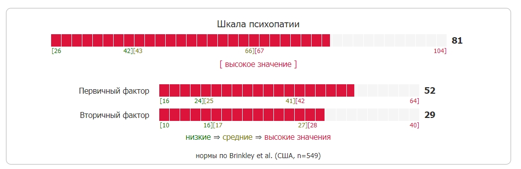 >>1384477 > к подруге уже не подкатишь после этого "Пообщавшись с твоей подругой, я понял, что ошибся в ней и недооценил тебя". Столько хуйни можно нагенерировать. >>1384478 Вспомнил. А я уже понадеялся, что нечто новое. >>1384489 > А ты знаешь какие-то типы кроме праймари и секондари? Классификаций много, хотя на уровне сортов шизоидов. То бишь, неофициальные. В Handbook of Psychopathy 2nd Edition есть раздел про сорта -патов, там этих классификаций от разных мань дохера. А так - строго говоря, даже внутри factor 1 и factor 2 есть facet 1.1, 1.2, 2.1, 2.2. Хотя больших откровений эти фасеты не привносят. >>1384489 Расшифровка аббревиатуры ИППЧ какбэ намекает. Хотя и там есть импульсивность. Почему - не помню, у Хаэра в Лишённых совести должно быть разжёвано. >>1384542 > Я про поражение нервной системы во внутриутробном периоде Вопрос в том, будет ли это считаться именно психопатией. В мкб-10 в категории f был раздел под органические поражения мозга, вероятно, это сюда. В мкб-11 по-любому тоже должен быть, влом проверять. >>1384567 > средняя корреляция FD с праймари, А точно средняя, не высокая? >>1384583 > Что-то связанное с проработкой депрессии? Нет, всё то же nature or nuture. Если человек с врождённой психопатией рос в нищете и говне, то с огромной вероятностью скатится в криминал и начнёт обивать пороги воспитательных колоний в раннеподростковом возрасте, может, докатится до вот этих ваших серийных убийц. Если была небедная семья и хороший старт, может стать наебизнесменом. Однако и то, и другое - редкие крайности.
