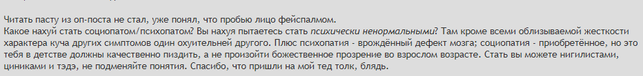 Прочие загончики контактного зоопарка: reddit, quora. Вбиваем в поиск psychopathy/sociopathy/aspd и наслаждаемся западными правозащитниками и сверхлюдьми.