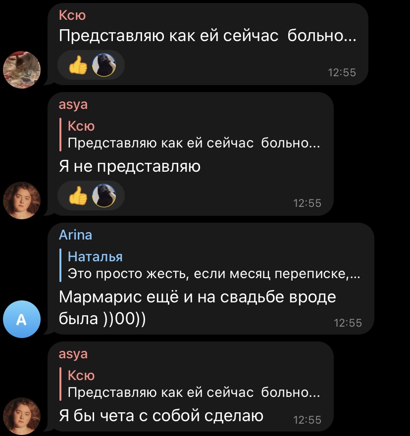 Заметили, кстати, что Юлик и Дася именно после свадьбы начали ходить на тусы чуть ли не каждый день вместе, хотя раньше Юлик ходил только в баню, а Дася дай бог раз в год куда то с подружками выйдет. Если по её словам они и правда переписывались месяц, то это как раз после свадьбы. Мармарис была на всех тусовках, где присутствовали Дася и Юлик? Если да, то всё становится понятно. Влюбился в девочку и начал шастать там, где она появляется, под предлогом "тУсОвКи", а Дася просто хвостиком шастала. Естественно, появилась неприязнь к Юлику, будто это он мой муж и предал меня, но больше к этой шмармарис. Кем нужно быть, чтобы рушить вторые отношения своим друзьям в одной и той же компашке, пиздец. Мерзкая, противная блядь. И судя по её постам в телеге ни капли сожаления. Заслуживает травли.
