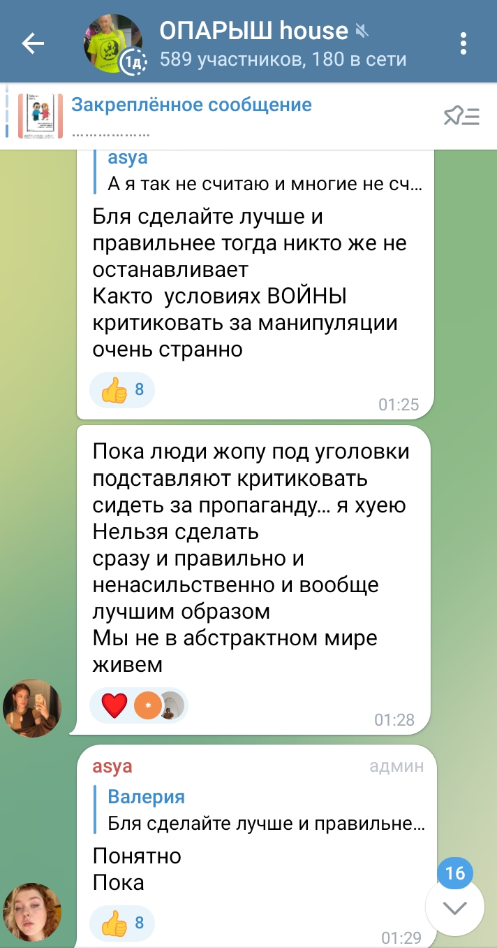 >>4321542 Пока Ася не может в конструктивный диалог ее хомячки выдают базу. В чем проблематика ФАС и писксель? ВО ВСЁМ. 1. Активистки живущие вне территории РФ, не могут придумывать адекватные акции для активисток живущих в РФ. Скорость ужесточения законов с февраля стремительно набирало обороты. Ранее за 4 бумажки не сажали в СИЗО. 2. ФАС придумывая акции создали инструкцию по безопасности спустя 3 месяца акций. Да, пункт «не оплачивать банковской картой в магазинах, где что-то развешиваете» это очень важная штука, тк по данным оплаты и вычисляли нескольких активисток. 3. ФАС не оплачивает штрафы, не нанимают адвокатов, не вытаскивают активисток из СИЗО и спецприемников. Причины такого отказа от активист/ок: не хотим добавлять копейку в казну, а где доказательства что это из-за нашей акции? Хотя облить красной краской или повесить ценник это их акции. И примеров куча: женщина облившая краской памятник у которой 3 детей и её повязали - «а где доказательства, что это наша активистка?». 3. Кому они пытаются картинкой лаф ис открыть глаза? Кому? Может быть почтальонам, которые не приносят повестки и которые наверняка о существовании ФАС или пиксель не знают, а может и знают. Или учителям, которые вместо детей пишут сочинения и «опаздывают» с классом на патриотические мероприятия? Или учитель физрук, который срывает символику с двери школы и получает штраф? Или владелец магазина продуктов, который освещает на стенах своего магазина происходящие? Им они что-то показывают и раскрывают глаза? Нет! Они всех людей, кроме умных айтишников конечно же, стирают в группу «тупое быдло из метро» и давайте распечатайте «газеты для ваших мам и бабушек», как будто среди мам и бабушек нет тех самых учителей или просто осознающих происходящее. Зато присесть за очередную газету или открытку в чатике в вотсапе можно, тк неизвестно кому она дойдёт, и кто возьмёт и настучит на отправителя. Кто хотел понять узнать, тот это уже сделал. Кто захотел принять иную позицию, тот её так же выбрал. Хватит с высоты своих светлых голов кого-то уму разуму научить. 4. Акции ФАС бездумные и опасные для активисток внутри страны. Единственное, что они делают это поднимают медийность Серенко и ФАС, которая уже всем кому не лень интервью раздала. Хотя она часто говорить за тех, чей опыт не переживала, что опять говорит о том, что интервью берут не у тех кого надо, а у тех кто популярнее. Это опять же пример того, как подминается низовой активизм. 5. Посмотрите на их последнюю акцию с роженицами в род.домах. Если не понимаете проблематику этой акции, то не отвечайте пожалуйста на моё сообщение. 6. Трагедия людей у них стирается в какую-то картинку лов ис, если не понимаете что тут не так, так же не отвечайте пожалуйста на мое сообщение. Не потому что считаю инакомыслящих какими-то не такими, просто не хочу споров на эту тему. 7. Про пиксель и писать особо нечего. Для неё посидеть в автозаке это весело, а тыкать другим «вставайте рабы» это окей. Пока ника жила в рф и спокойно не ходила на те же митинги, эти «рабы» стояли с плакатами и получали пи*ды от сотрудников, штрафы и уголовные дела. Сколько людей выходило на марш мира, болотное, дворцовое, сколько протестов было за 20 и более лет, сколько за это время было ужесточений законов, уголовных дел, рост числа сотрудников, закупки у других стран средств подавл