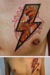 Уродство какое-то. Вообще не понимаю зачем забивать тело кучей мелкий не связанных друг с другой ни темой, ни стилем татуировками. Имхо лучше одну но большую и цельную идеей или стилем, в общем имеющую художественную ценность, а не этот пиздец что у него.