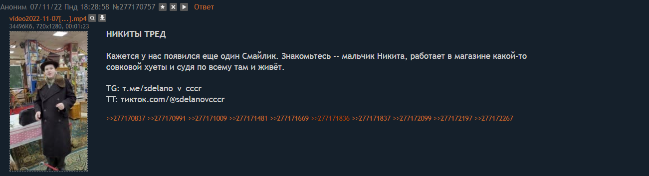 >>277203971 Так это норма при аутизме или что там у него. Он еще людей перебивает и не имеет эмпатии совсем. Такие когда-то случайно находят свой мирок , у Никиты это дроч на ссср и радиолы, и пропадают в нем. Им нужна понятная среда, в которой они будут варится. Вот он каждый день и ездит на метро в этот магазин и тусуется там, плюс своим видом привлекает клиентов и подписоту в тиктоке.