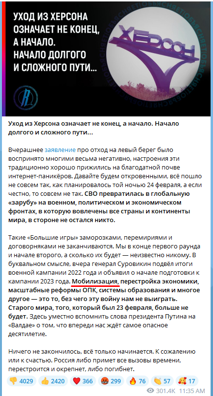 Очень жаль, что российское быдло этого не понимает и пытается кричать "Херсон - наш". Неделю-две до полной зачистки и теперь будет уже и де-факто не их. А весь этот треп, устрашение карательной 280 - это уже от полного бессилия