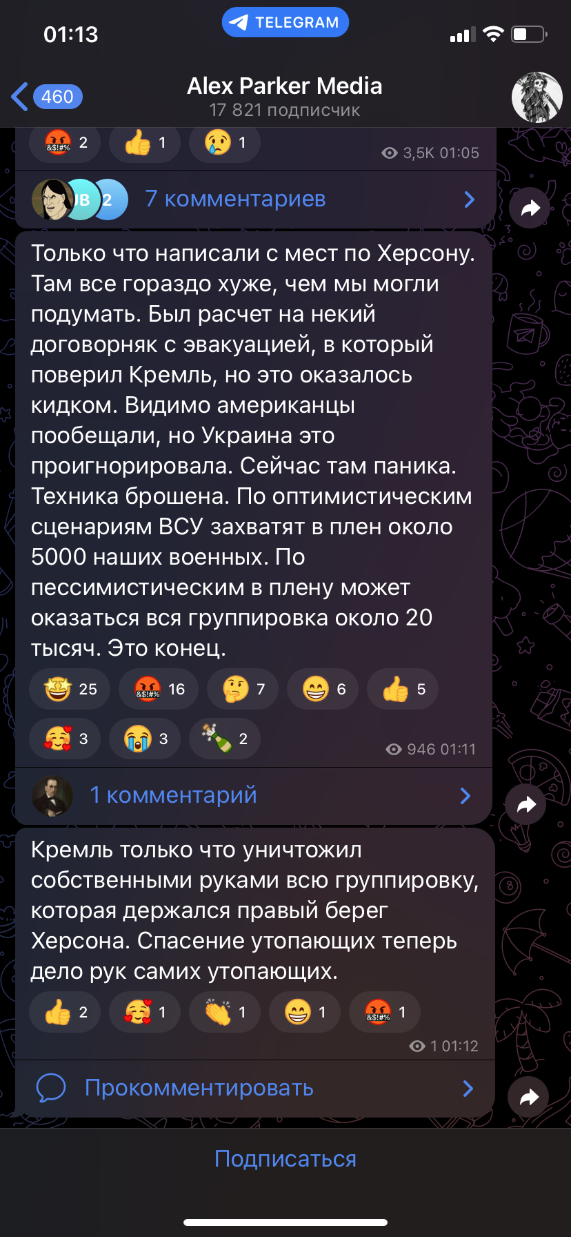 Я слышал, что Херсон ВСЁ. Это плохо для трясунов. Включаем логику. 300к мобов куда-то делись. Охуенные, с мобилизационным предписанием в военнике, с топовой ВУС. Уж для того, чтобы зацементировать в обороне включенные области, таких универсальных солдат достаточно. Но что-то там палёным мясом на фронте пахнет, даже у меня отдаёт. Хуёвые у меня предчувствия. Там в телегах, как бульки, вбросы всплывают, что на следующей неделе Питун совет безопасности будет созывать экстренно, типа из-за этого он на саммит не поехал.