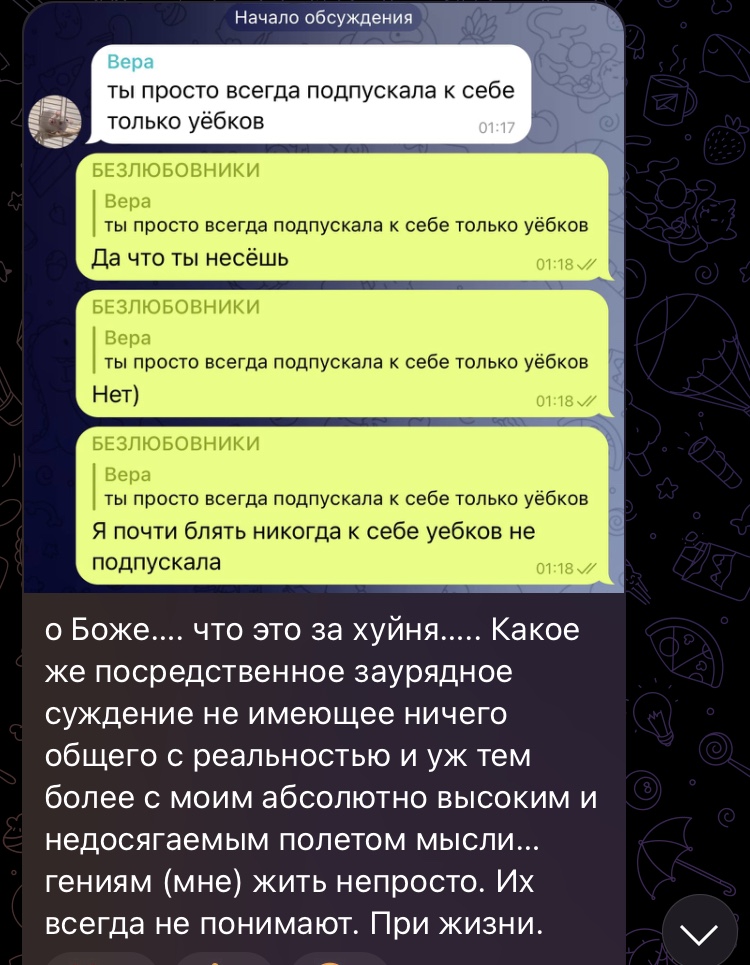 Я вообще в муренач изредка захожу и тем более не слежу за всеми местными персонажами за пределами этого треда, но какого-то хуя глядя на этот пост сразу поняла, чьи это скрины и чья эта девка. Пиздец, зачем я это всё помню? Нахрен мне этот мусор в голове.