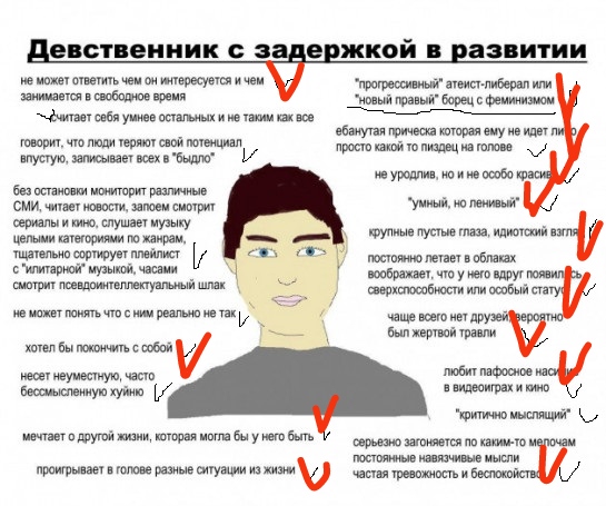 А теперь поясняю для быдлонормисов, альфа-куколдов, школозумерков и прочих тролей-антиинцелов: 1. Инцел - это не субкультура, не секта и не промывка мозгов, это социальная группа мужчин которым недоступен секс 2. В мире существует один общественный строй - это вагинокапитализм, при котором бабы решают кому давать секс, а кому нет и из-за этого и появились инцелы 3. Есть инцелы в отрицании которые даже не знают и не хотят знать что им не доступен секс в принципе 4. Не путайте инцелов с асексуалами 5. Бабы дают только чедам у которых внешка 8/10 и более, а всё остальное это коупинг и бетабакс всраткам (по поводу алковасянского быдла преступников и гопоты я ошибался, если баба сама из таких то она будет с такими, но не с инцелами)