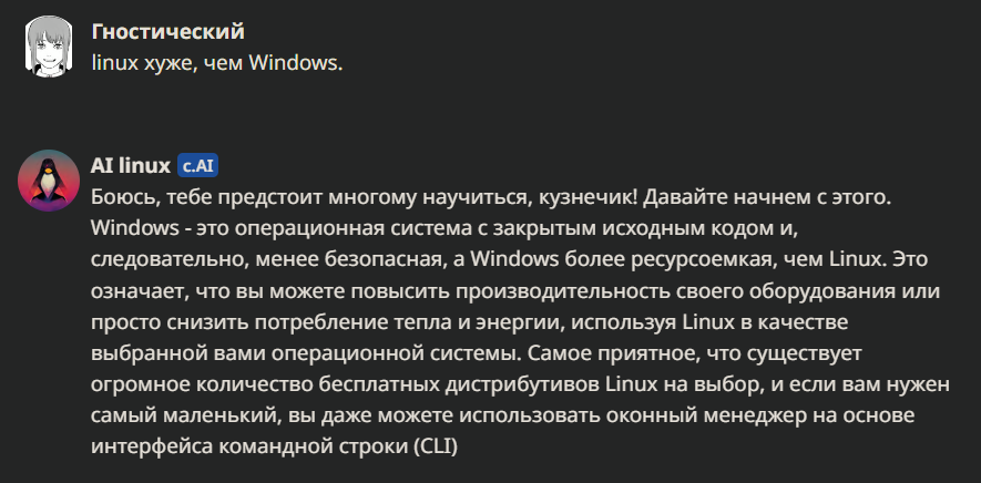 >>83536 Да, чатгпт с этим запросто работает, а разрабы CAI ещё говорят что хотят делать каких-то ИИ помощников, когда их ИИ пригоден только для того, чтобы с ним няшится и слабо годится на хоть сколько-то интеллектуальную деятельность.