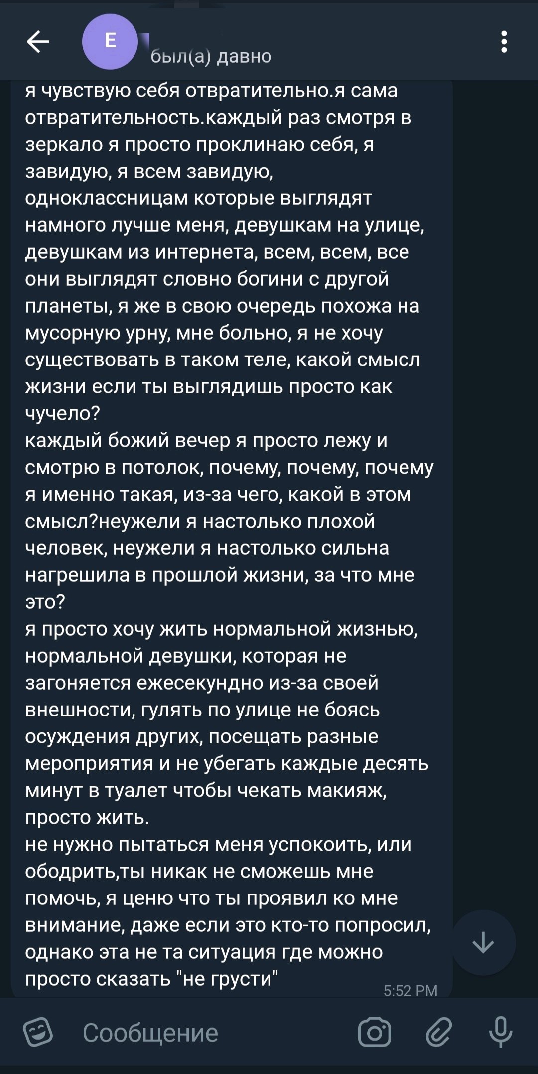 Правильно поступила, уебан ты конченный. У девочки дисморфофобия, а ты такой "ну да, ты страшная, но жить можно"