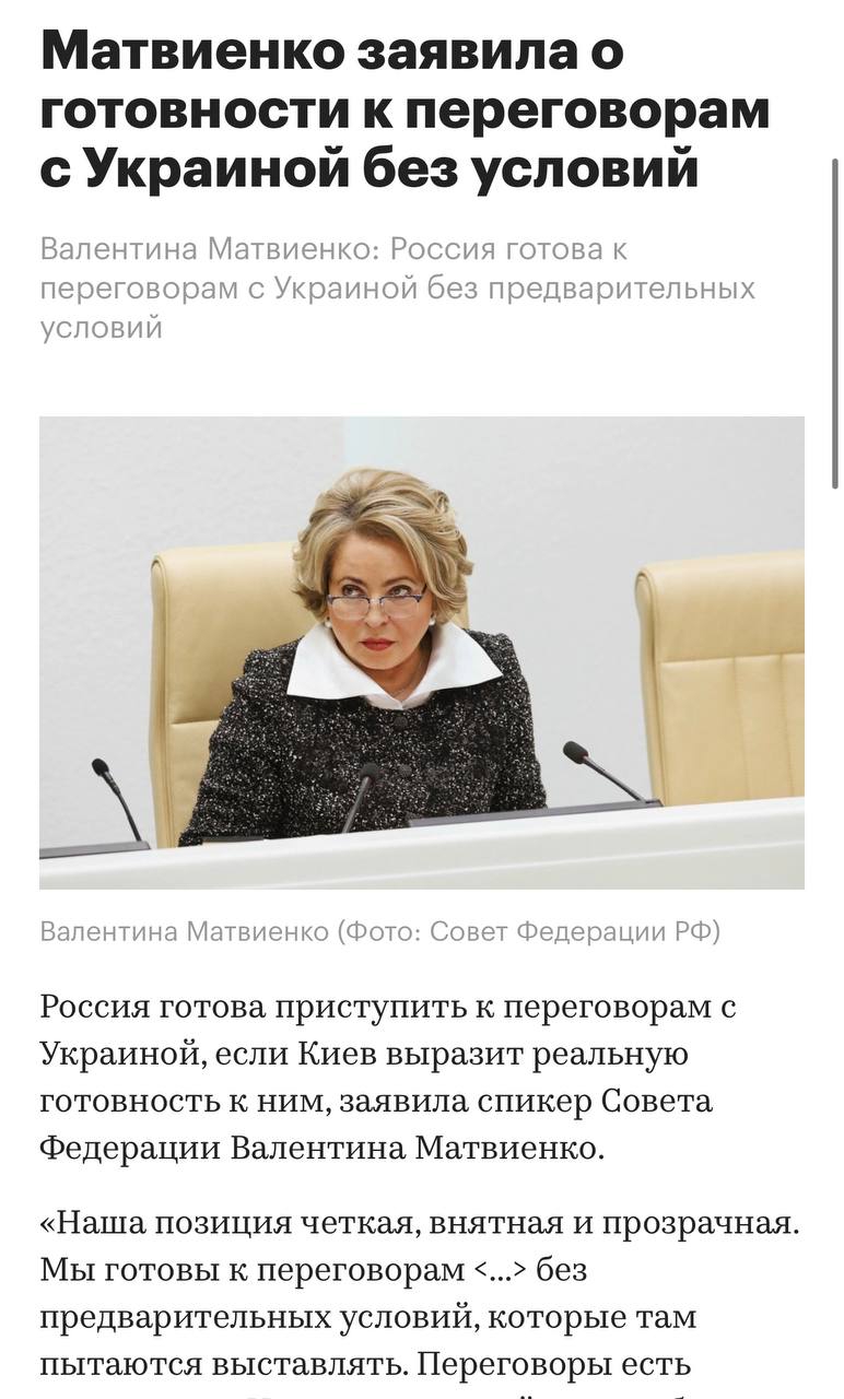 >>53668538 Матвиенко заявила о готовности к переговорам с Украиной без условий