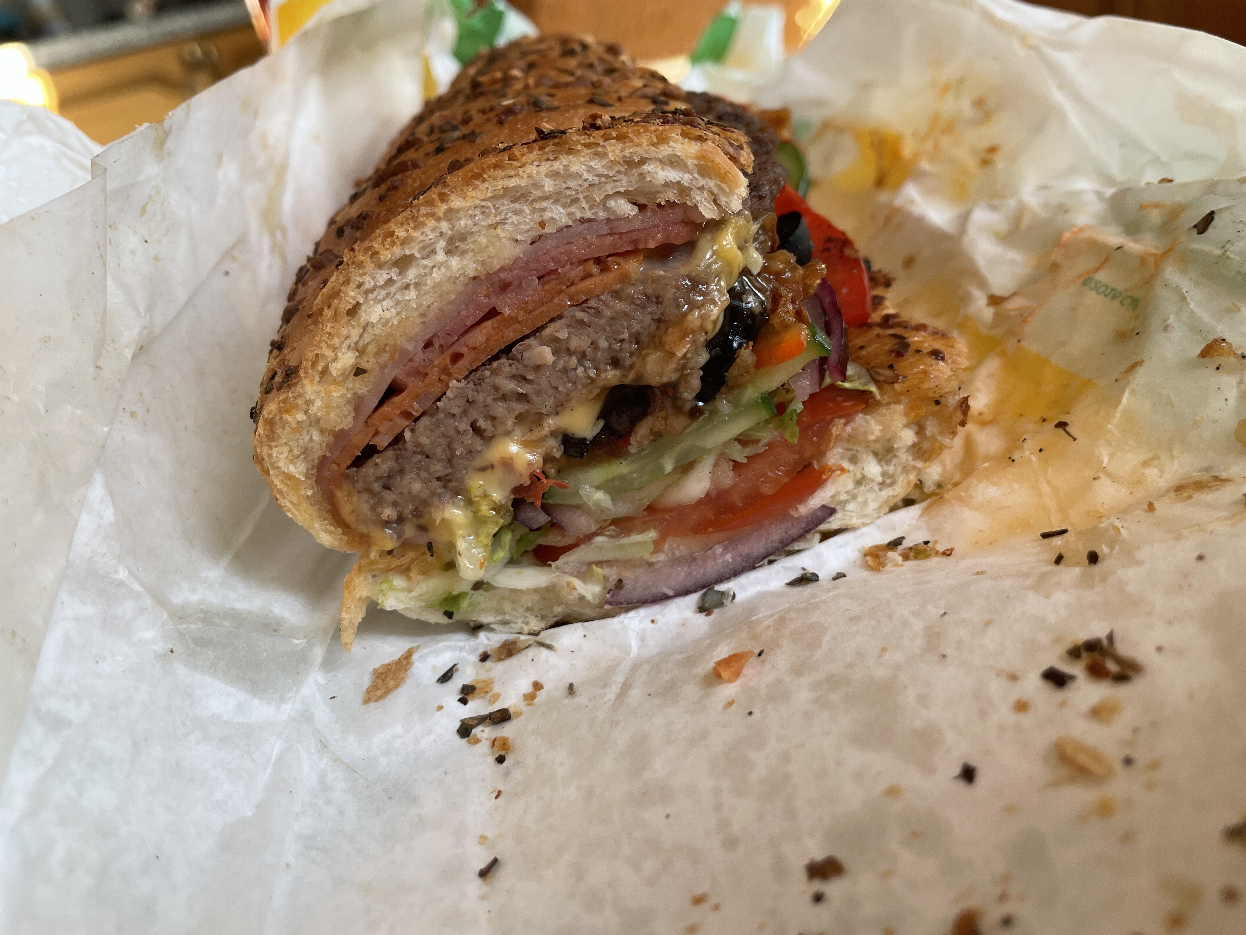 Пикрелейтед саб дня с итальянским бмт, допы: 2 котлеты, жареный лук, соус сладкий лук, на овощи масло, соль, перец. Две прожарки (до того как положили овощи и после).