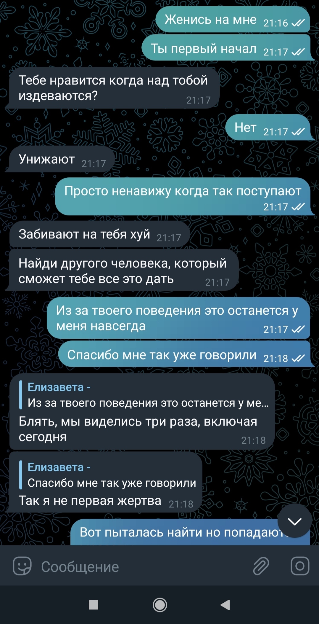 >тян 19 лвл, девственница, никогда не было парня. >Мне долгое время никто не нравился. >Мне кнш всё это казалось лютой залупой но я общалась с ним >Мне не хотелось чтобы меня кто-то трогал, мне было стрёмно что может кто-нибудь увидеть >парень был каким-то нелепым ,слишком для меня старый,занудой и я подумала что не влюблюсь в такого никогда >Я уже через всё это проходила на других свиданиях >Рассматривая его аниме фигурки я подумала что он неудачник >И так я приехала к нему домой и мне было скучно >Вроде у него доброе лицо и выглядит моложе своих лет но я чувствовала это раздражение >я напилась из за скуки >Не знаю зачем я выпила может хотела дать ему шанс. >Женись на мне, я шикарна