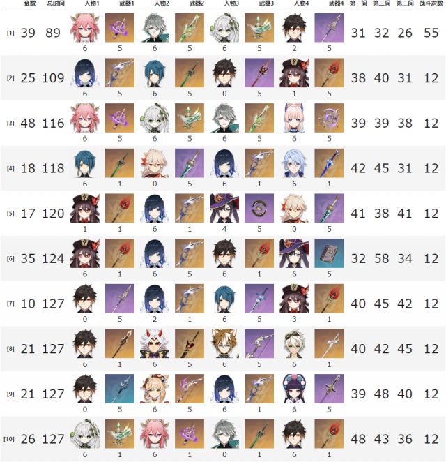 Немного картинок. Помните на спирал абисс была колонка со средней скоростью закрытия комнат каждой самой используемой командой? Такая же табличка есть у китайцев, но выборка 1300 человек. Это не спидран. Просто среднее время закрытия. Стоимость - это показатель количества лег в команде. Лег оружие считается за 0.5, лег персонаж за 1, консты тоже за 1, четвёрки и консты 0, четверочное оружие и рефайны 0, эксклюзивное 4* оружие - 0.2