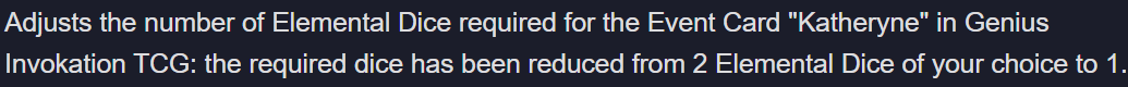 Изменения и улучшения ● Священный призыв семерых Изменено описание боевого статуса «Грохот и искры» карты персонажа Кли. До изменения: «Когда ваш персонаж использует навык: вашему активному персонажу наносится Пиро урон, 2 ед. Применения: 2» После изменения: «Когда персонаж в отряде использует навык: активному персонажу наносится Пиро урон, 2 ед. Применения: 2» Изменено описание карты таланта «Грех гордыни». До изменения: «Когда у вашего Электро персонажа с этой картой есть Воронье покрывало, элементальный навык и взрыв стихии наносят на 1 ед. урона больше» После изменения: «Когда персонаж Кудзё Сара с этой картой на поле боя, у ваших Электро персонажей со статусом Воронье покрывало элементальный навык и взрыв стихии наносят дополнительно 1 ед. урона» Количество Элементальных дайсов, требуемых для карты события «Катерина», изменено с 2 любых дайсов до 1. Изменён эффект взрыва стихии «Вознесение нереиды» карты персонажа Сангономия Кокоми. До изменения: «Наносит 3 ед. Гидро урона. Персонажу достаётся Церемониальное одеяние» После изменения: «Наносит Гидро урон 2 ед. Восстанавливает 1 HP всем вашим персонажам. Текущий персонаж получает Церемониальное одеяние» Изменён урон боевого статуса «Радужная стойка» карты персонажа Син Цю с 2 ед. Гидро урона до 1 ед. Гидро урона. Изменено количество Элементальных дайсов, необходимых для карт экипировки «Заблудший в метели», «Сердце глубин», «Горящая алая ведьма», «Громогласный рёв ярости», «Изумрудная тень», «Архаичный камень» и «Воспоминания дремучего леса» с 3 дайсов одного элемента до 3 любых дайсов. Улучшен дизайн некоторых иконок. Путешественники, собирая награды в меню уровня игрока или Руководства для игроков, могут получить их даже в случае превышения их лимита. Такие награды будут отправлены в рюкзак. Если карты, которых нет в наличии в Карточном магазине, можно получить другим способом, он будет указан в меню описания карты. За первое выполнение гостевого испытания каждой недели вы будете получать по 1 ед. мастерства (за повторные победы в прошлых гостевых испытаниях очки мастерства получены не будут). Удалены рамки слева и справа во время игры на мобильных устройствах. Оптимизировано управление при использовании контроллера: В фазе бросков удерживайте кнопку выбора и двигайте левый джойстик, чтобы выбрать несколько дайсов. Кнопка завершения раунда будет отображаться даже без наведения курсора. Движением джойстика теперь можно переключаться между колодой и навыками персонажей.