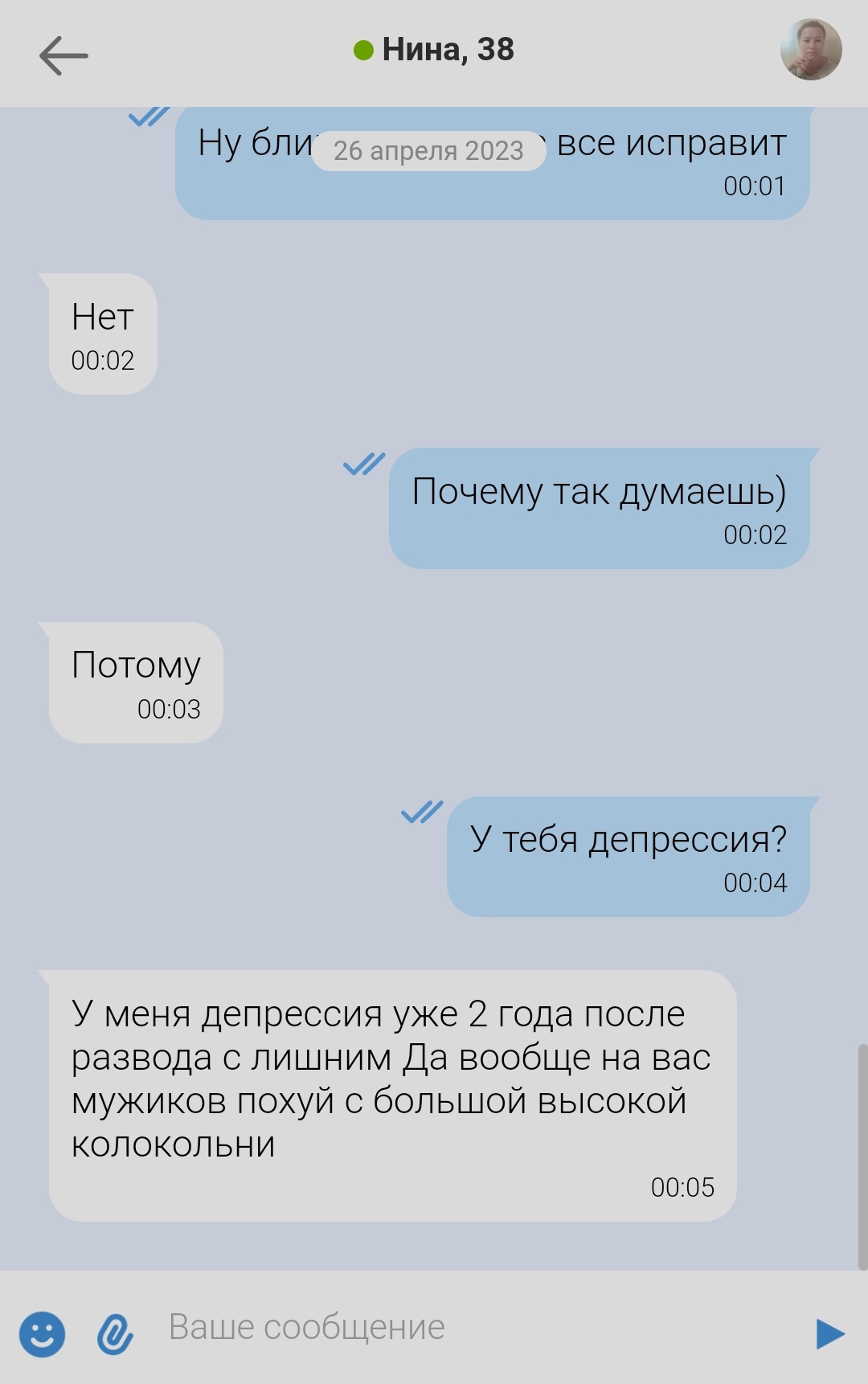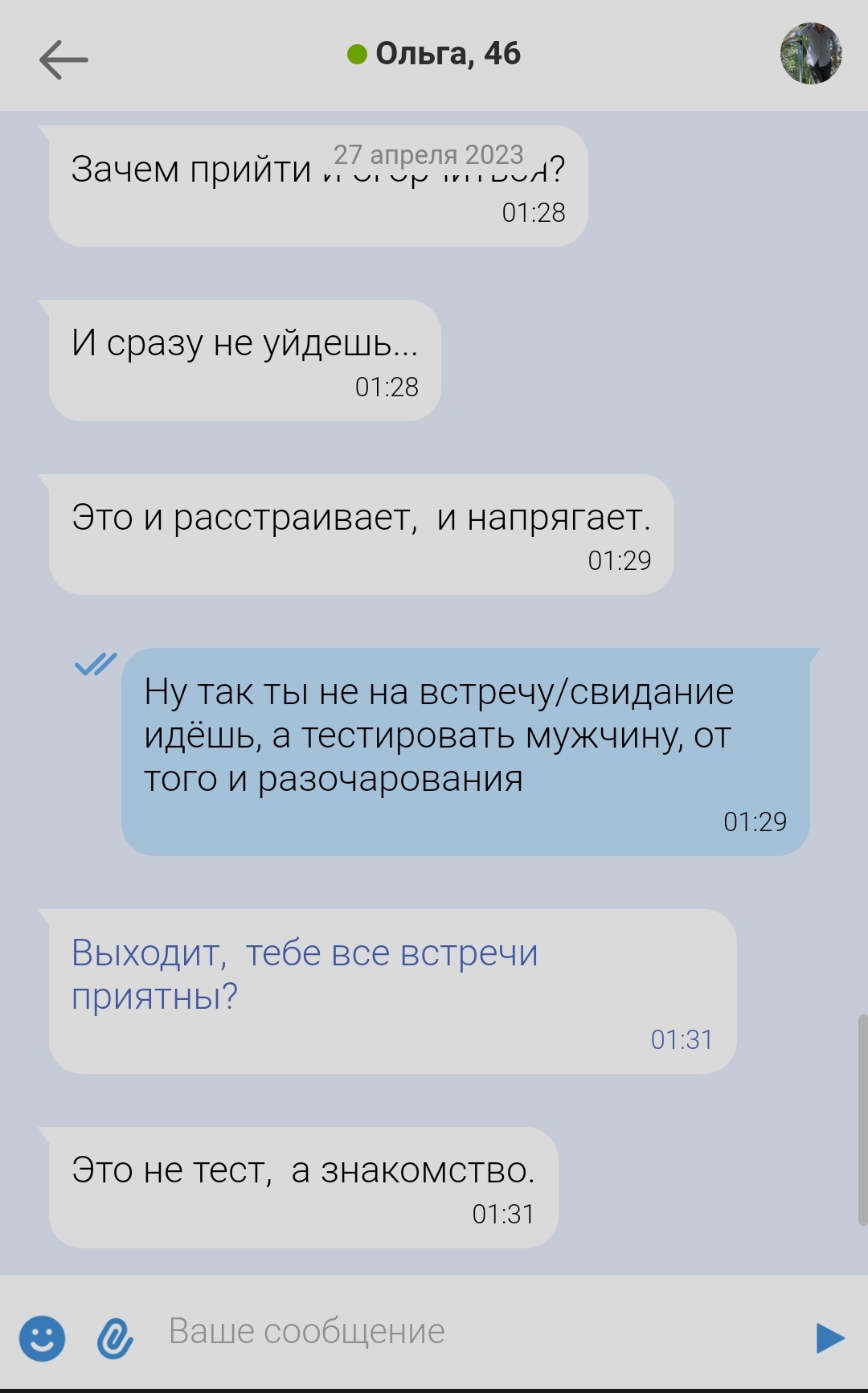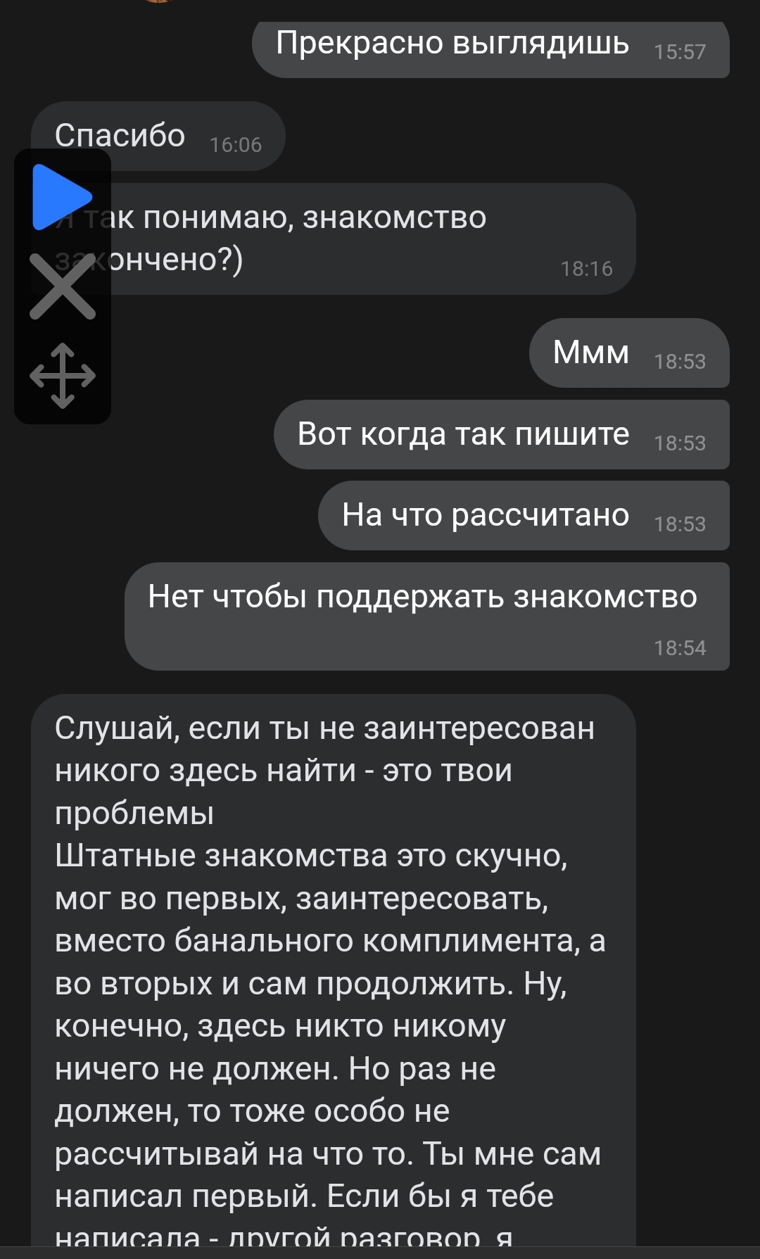 Кстати, забавно, что недавно была тянка - судя по всем косвенным признакам я ей зашел, но мне она чет не особо. Не то, чтобы страшненькая и т.д. просто не мое. Я хотел просто общаться т.к. совсем подруги кончились и такое впечатление сложилось, что ей показалось, что мне она не понравилась - я решил ей написать и в итоге она ответила, а на следующий день игнорить стала ахахахахахаха