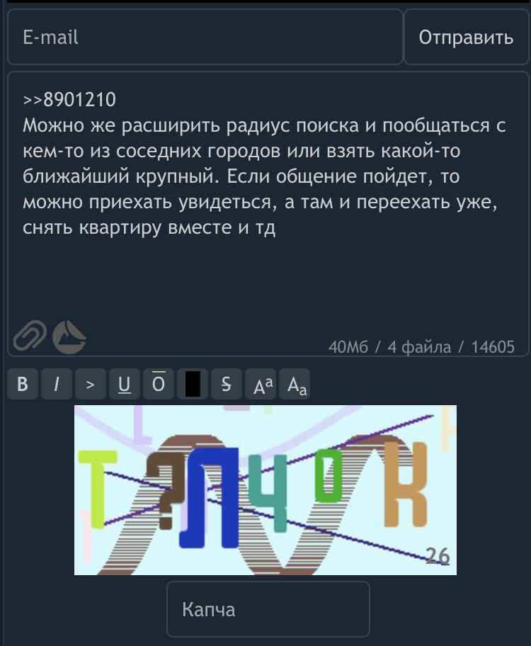 >>8901210 Можно же расширить радиус поиска и пообщаться с кем-то из соседних городов или взять какой-то ближайший крупный. Если общение пойдет, то можно приехать увидеться, а там и переехать уже, снять квартиру вместе и тд даже капча говорит, что тебе нужен какой-то толчок но может это про парашу, конечно