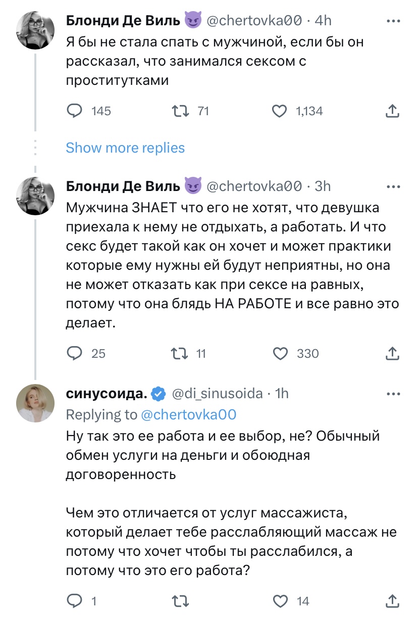 Так с проституцией по сути то же самое. Понятно, зачем и в каких обстоятельствах женщина соглашается на такое. Но блядь человек среди бела дня решает заплатить деньги, чтобы изнасиловать человека, насилует его и идет безнаказанно домой, и это вообще даже не обсуждают, как будто это норма. Про криминализацию клиентов говорят очень мало, и в бытовых обсуждениях типа того, в котором участвует свинусоида, тоже все про проституток, ой а хотят ли они, а вдруг им нравится и тд. Хотя там изначальный твит как раз про отвращение к чуханам, которые этим пользуются. Но эту тему сразу заминают, сведя фокус к проституткам, как будто это полностью их ответственность