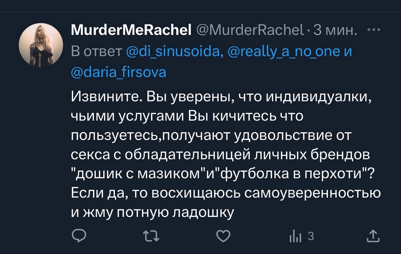 Также добавлю что тот факт, что хуемрази не видят проблему в том, что их не хотят это и есть часть патриархальной объективации женщин. И одно без другого не идёт. Не может кун которому норм купить к себе влечение быть хорошим куном, который хорошо занимается сексом и не относится к НЕ проститутке как к объекту. Это основная ошибка всех подстилок. Им кажется что они попали в тот список ОСОБЕННЫХ женщин которых он уважает и ради которых он будет стараться, но нихуя. Он также видит в ней объект и ему также похуй на ее удовольствие. Синус яркий пример. Что мешает Мыше лизать ей каждый день? Нихуя.