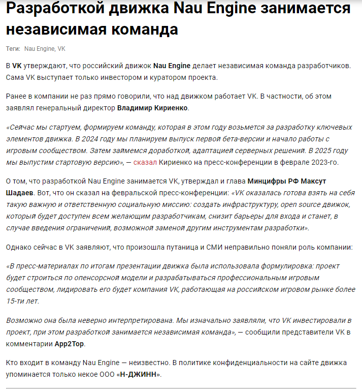 Там на самом деле запутанная ситуация с тем, что за компания создает Nau Engine, кто её учредил и так далее. Но важно было указать, что VK просит больше не называть этот проект «Движок от VK».