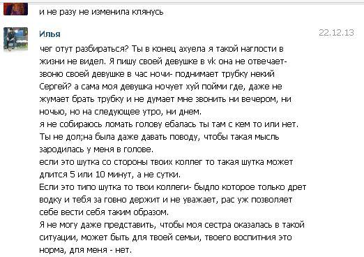 Сап, вечерний. Навеяно тредом ОПа, следящего за своей тян. Только что прочел переписку своей тян вкалтакте и выяснил, что она уже достаточно давно изменяет мне с коллегой по работе. С тян встречаюсь больше 2 лет, живем периодически вместе (хата ее), уже готов был сделать ей предложение, собирался подзаработать денег на свадьбу. Из переписки непонятно, знает ли ее ебырь о моем существовании. Реквестирую годных планов мести. Горячку пороть и сразу кидаться бить ему ебало не собираюсь (хотя это не проблема, он - мелкий пиздюк, я крупный крепкий 180/93, занимался боксом и миксфайтом). Послежу за ней чутка, планирую взять своего кореша-братуху-борцуху и таких же его корешей и поговорить с ним по-мужски, но сейчас пока еще не решил как это лучше обстряпать, мысли путаются. Тян - всегда отыгрывала роль ламповой няши-стесняши - мечты анона. Вообщем реквестирую советов мудрых о планах мести страшной, есть ключ от ее хаты, физический доступ к ее ноуту. Вообщем вискас.
