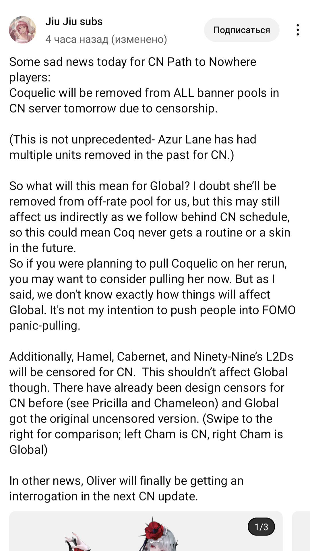 >>54560 На глобале игре пока всего 4,5 месяца, оригинальной китайской версии только недавно полгода стукнуло. Разрабы тут довольно лояльны, читают отзывы и после этого иногда даже вводят всякие фичи и QoL. Например, скоро для тех, кто упустил возможность выкупить особые ивентовые краймбренды (местные карты экипировки), выделят отдельную вкладку магазина в будущих ивентах такого же типа и пропущенные карточки можно будет забрать там.