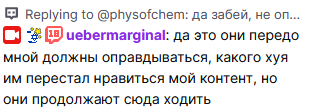 >>20676964 У него как у гительмана аудитория 90% хейтеры. Даже в тг марципановый ликёр можешь зайти и почитать каменты, большинство тупо угарает над чмом, особенно после вчерашнего стрима с соевой конфой копрододиков.