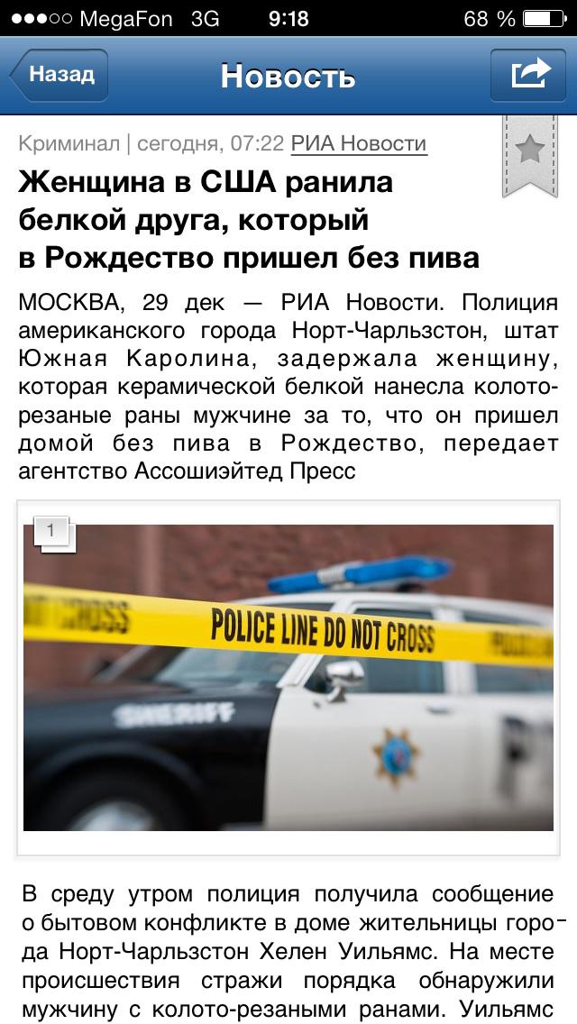 МОСКВА, 29 дек — РИА Новости. Полиция американского города Норт-Чарльзстон, штат Южная Каролина, задержала женщину, которая керамической белкой нанесла колото-резаные раны мужчине за то, что он пришел домой без пива в Рождество, передает агентство Ассошиэйтед Пресс