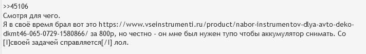 >>19039 Ну и да, я когда про отвёртки говорил, они Тайвань, а этот набор - Китай. Но у меня домкрат от ДТ подкатной китайский - вроде заебись и обзоры на наборы инструмента я смотрел, там ДТ не хуже Джонсвея проявилось. Короч выбирать тебе, но я второй набор от ДТ возьму потому что нищук