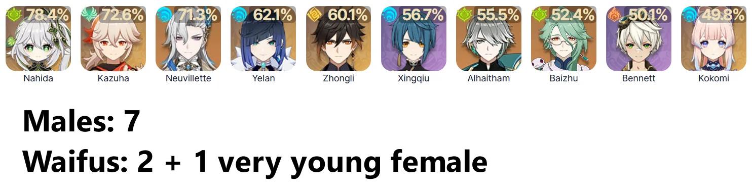 У меня нет 6 персонажей: Альбедо, Байджу, Вентиля, Невиллета, Хайтама и Аято, и забирать я буду их в той последовательности, в которой написал их имена. Рано или поздно планирую собрать всех персонажей, даже тех, что мне не нравятся.
