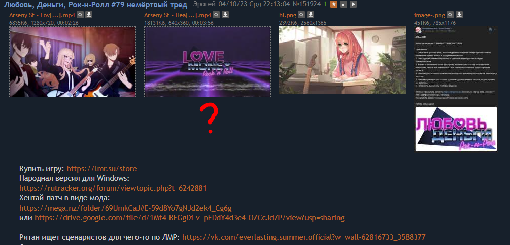 Я лишние ссылки из шапки поубирал и более читабельное оформление сделал. В "разделе" для мододелов только 2 ссылки актуальные в текущих условиях - гайд с ассетами от Фестиваль-куна и, собственно, документация по модам на сайте ЛМР. Моды оставил только Фестиваль как лютый шин и Во все ноздри, оба с упоминанием что они запилены анонами из треда. Потому что в прошлом перекате залётные спрашивали, кто что творит из местных. Ну и из-за длинного скрина в текущем перекате случился пикрил. Некрасиво, учитывая что наш тред обычно в самом верху /ruvn/ после закреплённого, но в целом похуй.