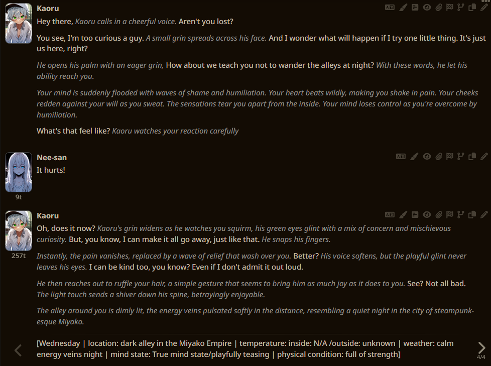 >>589738 Если из 15 свайпов помогло - значит все есть, просто жестокость недостаточно уместна в мире и надо чуть-чуть побольше контекста добавить, чтобы твой перс прорвался через сою прямо с самого начала РП