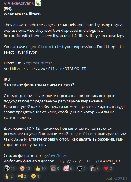>>2567312 >Игнор везде, втч в коментах и чате. Я тебя понял, но хочу тебе сказать, подобной функции не было даже в Telegraher, если мне не изменяет память, но я конечно могу ошибаться. Про остальные мод-клиенты, я вообще молчу. >В душе неебу, потыкай менюшки, полижи эго авторам Чел, не передёргивай. Достаточно просто зайти в FAQ, либо же просто зайти в чат, и спросить у разрабов или людей насчёт этого. Вот даже строчка из FAQ в которой прямо говорится, что ты можешь с помощью регулярки скрывать слова, предложения и ссылки. Да, и в чате поднимался подобный вопрос, но из-за лени re:nightly (один из разработчиков, если не ошибаюсь) добавить пару строчек, данный функционал попросту отсутствует.