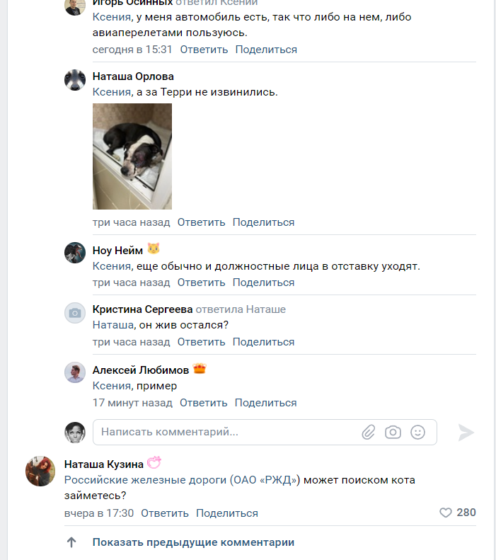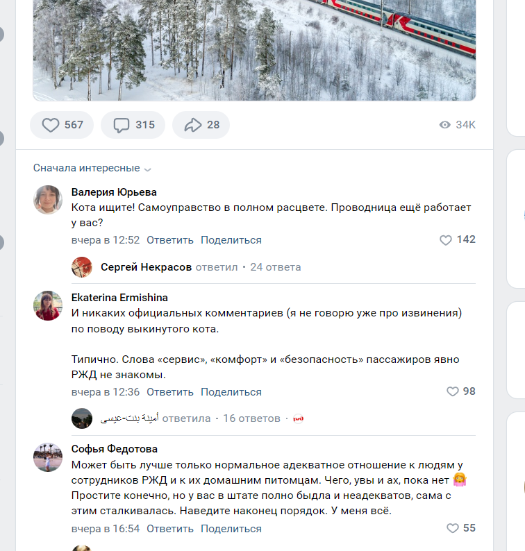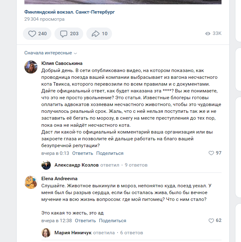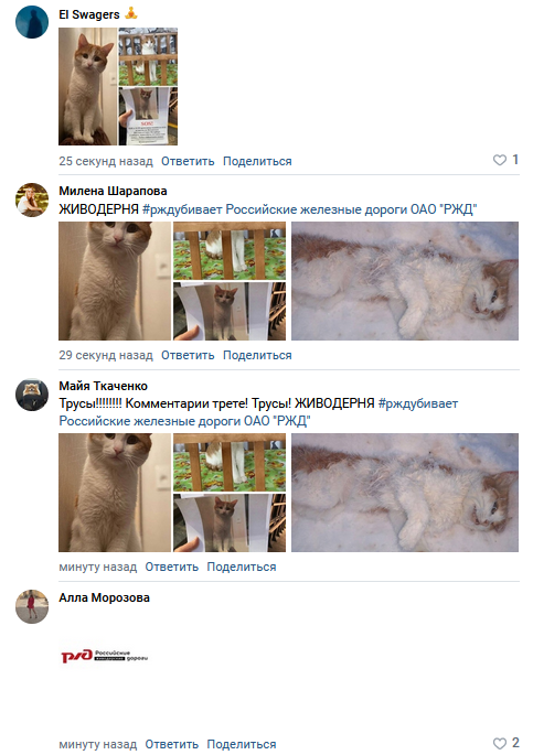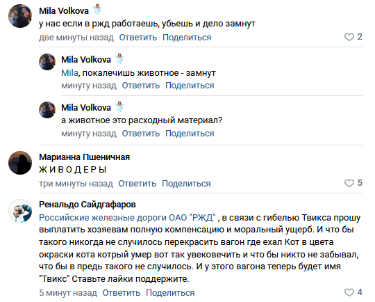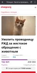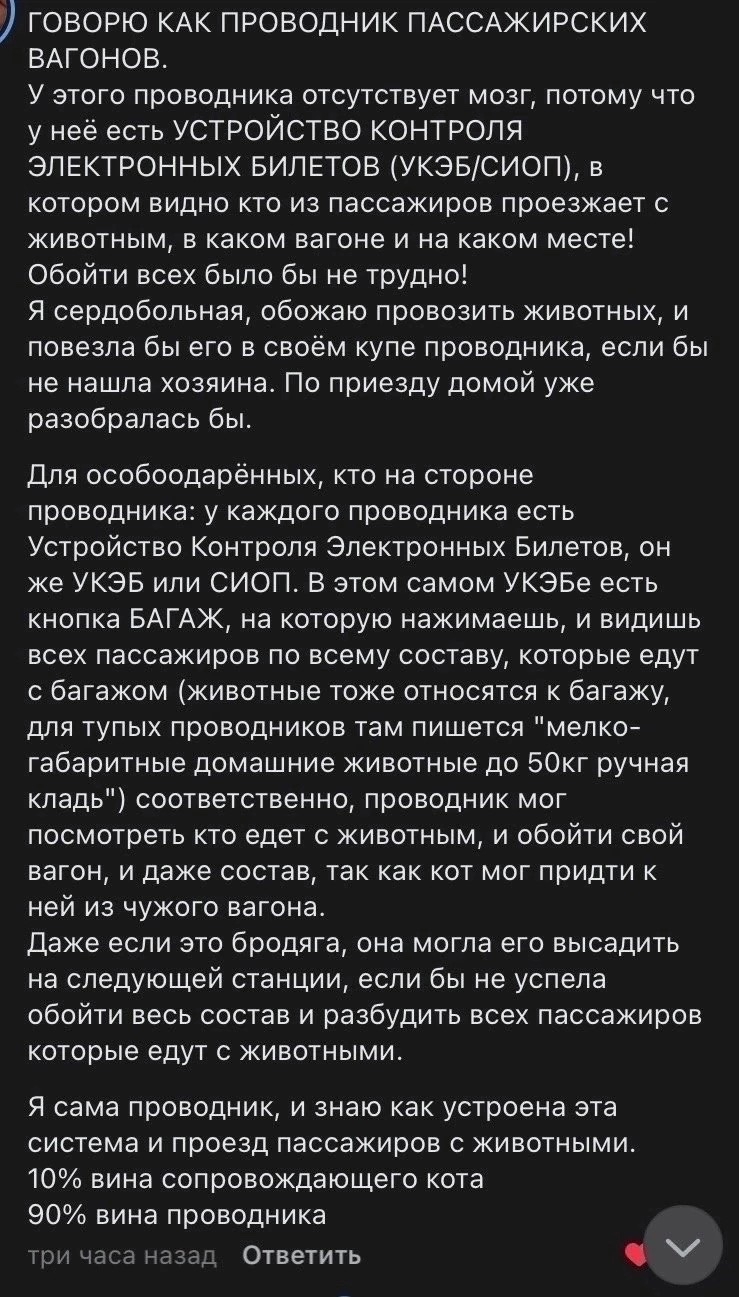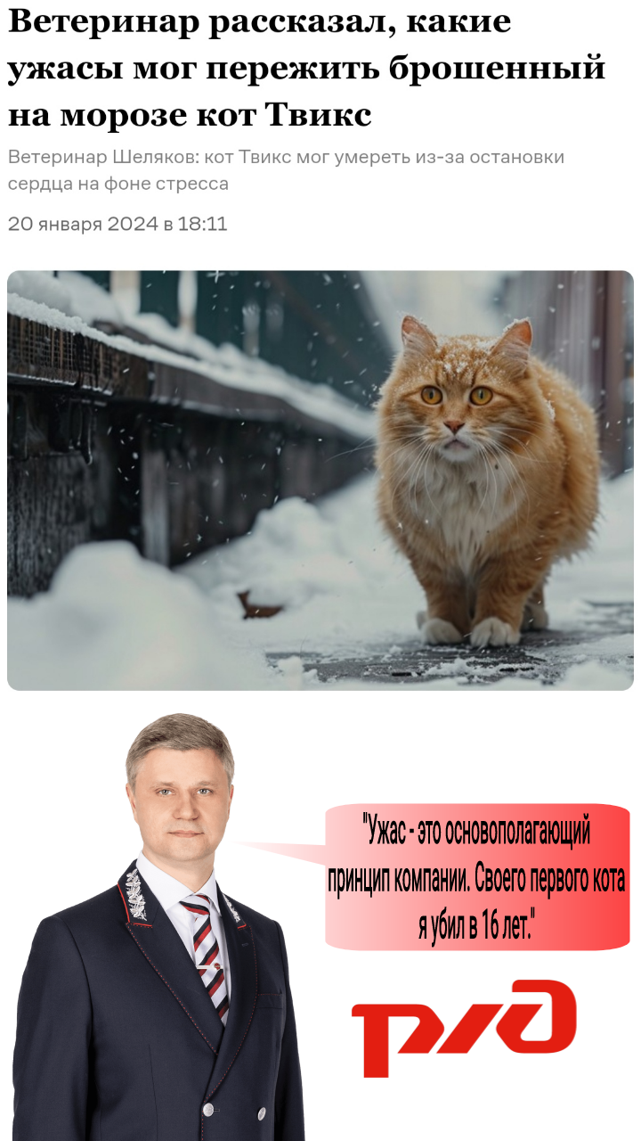 Котику купили билет, чтобы он спокойно доехал от Екатеринбурга до Тихвина в сопровождении пожилого человека, который уснул в купе. Кот по какой-то причине выбрался из переноски. Проводница РЖД знала, что у ней едет кот, но цинично выбросила его на мороз в Кирове. Котик целую неделю ждал около железной дороги на морозе, что его заберут. Его нашли мёртвым. ФПК/РЖД лепит клоунские отмазки, что проводница действовала по инструкции. Пиздёж. Таких инструкций нет. РЖД судорожно нагоняют ботов, чтобы вайпать народный гнев.