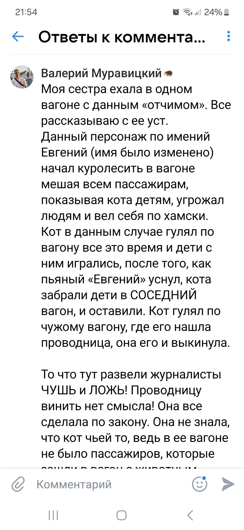 >А тут еще и блохастый и его хозяин алкаш-распиздяй, который напившись бояры, забил на блохастого в общественном месте перекладывая на бедную проводницу отвественность за животное. Я как бы не оправдываю ее - она неправа, но давайте откинем эмоции и попытаемся стать взрослыми.