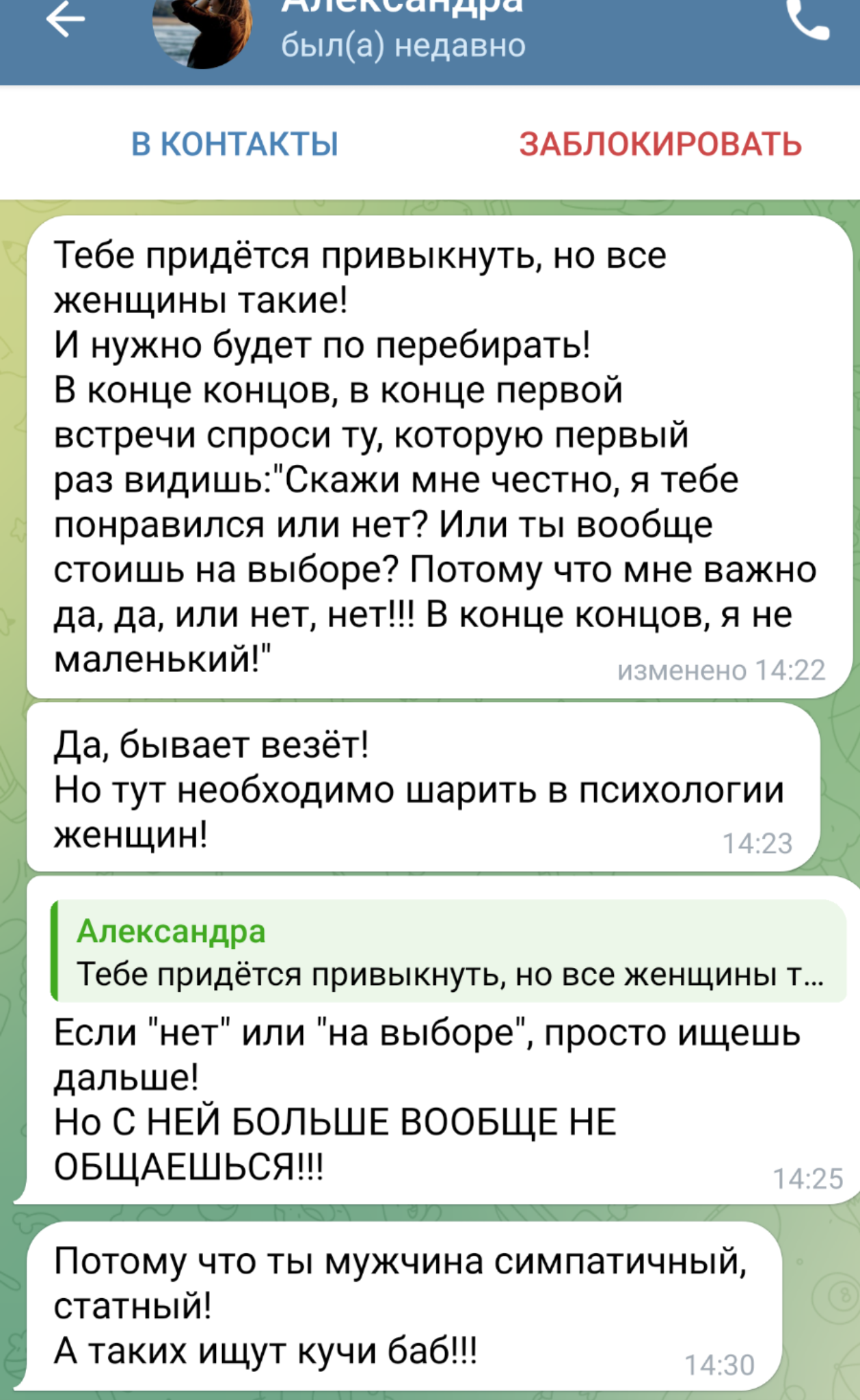 Если бабищу расстраивает, то что ей пишут "Привет", а не хуй пойми что сочиняют, то такую бабищу надо сливать, ибо нихуя себе она царевна, а ты, анон, пляши и развлекай мадам, которая из себя представляет разве что тарелочницу. Не то, чтобы мне не было похуй на подобные ресурсы, просто день не задался, вот и решил сорваться хоть на них