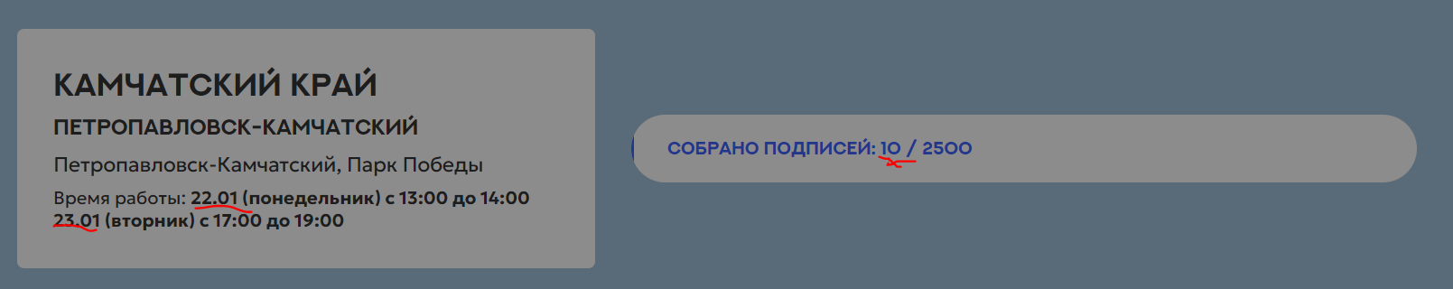 > И те цифры по регионам что указаны на сайте означают, что физически люди оставили там подписи, но зачтены они могут быть за другие регионы, важна лишь прописка человека