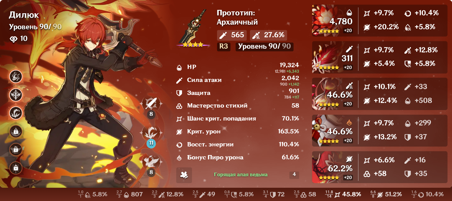 нууу, Дилюк на максималках, те же самые проблемы прослеживаются, вроде и прикольно, что он такой самодостаточный сам себе кулдаун снимает, сам себя дамажит и сам же хилит, но в итоге сильно много времени отбирает. Если выкручу Цаплю поглядим как он с ней играет, пока что неплохо, но увы, не уровень Шеврез, хотя 25к с планжа на 80 уровне с 4 уровнем таланта в артах солянка — это ок.