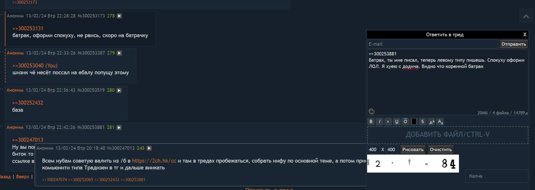 >в закрепе с названием "тред общих вопросов" 1000 постов к ряду 24/7 обсуждают жирного шизика, его машину и его дохлую бабку
