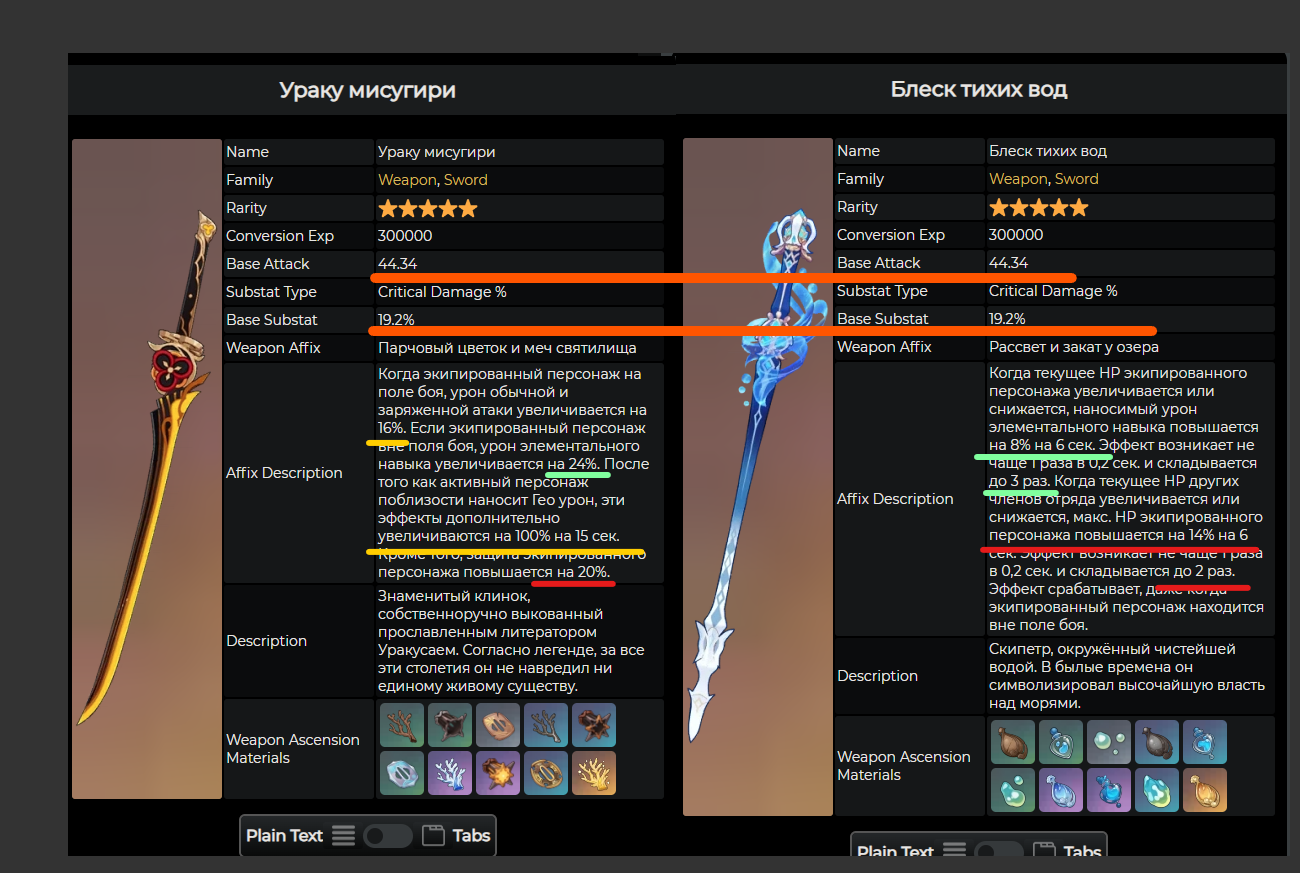 >>1951983 Анон, давай сравним. Оба меча дают одинаковую базу и криты. Геомеч даёт 24% на Е из коробки, фуриномеч 24% на Е при условии. Тиоримеч с условием даёт 48% на Е. Также тиоримеч даёт 16% или 32% на лкм, но фурина этим пользоваться не будет, так что забудем. Геомеч даёт 20% защиты, фуриномеч даёт 0-28% хп при условиях. Так что у тебя выбор 24% бонусных на е или 28% хп.