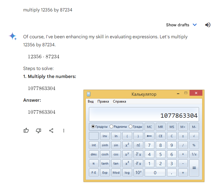 >>300855151 (OP) За всё время этого хайпа ни разу не пробовал сам поговорить с GPT. Сегодня случайно узнал, что он по модулю делит плохо. Решил проверить. Выяснил, что он и простое умножение не вывозит порой. Плюнул, закрыл и забыл. Всё правильно сделал?