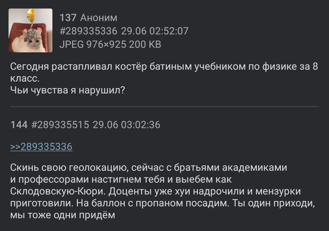 >>301302371 >3 Да какие гипотезы, это комета упала. Что это еще могло быть? Тоже мне - загадочное событие. Огромная глыба грязного льда, гигантский светящийся хвост, который аж из Москвы было видно, огненный болид, взорвался в воздухе, как челябинский метеорит. Ударная волна повалила лес, а сам он разлетелся на миллион осколков, которые испарились или разлетелись по округе, смешавшись с местным снегом и льдом. Поэтому никто нихуя и не нашел. Как ты отличишь космическую пыль от местной грязи? А тем более лед. Комета это была, и ничто другое.