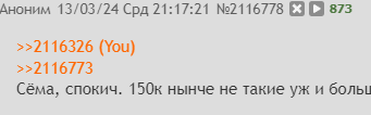 >>2116326 >>2116773 Сёма, спокич. 150к нынче не такие уж и большие деньги, мои друзья погромисты по 300+ зашибают. Они правда работают в 10 раз больше меня.